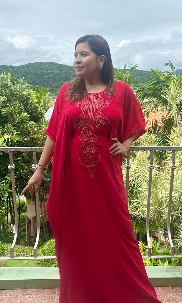 Our Douha Kaftan is handmade in an atelier in Marrakesh. Light and cool to the touch, this versatile piece can be used as resort wear, lounge dress, beach cover up or as a maternity dress.